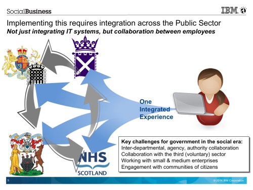 Cross departmental collaboration, cross agency collaboration, cross public sector collaboration – and, indeed, collaboration beyond to include local government, the third sector, delivery partners and small & medium enterprises who can help to service the citizen’s needs. The first challenge for government was integrating services – the next is integrating people.